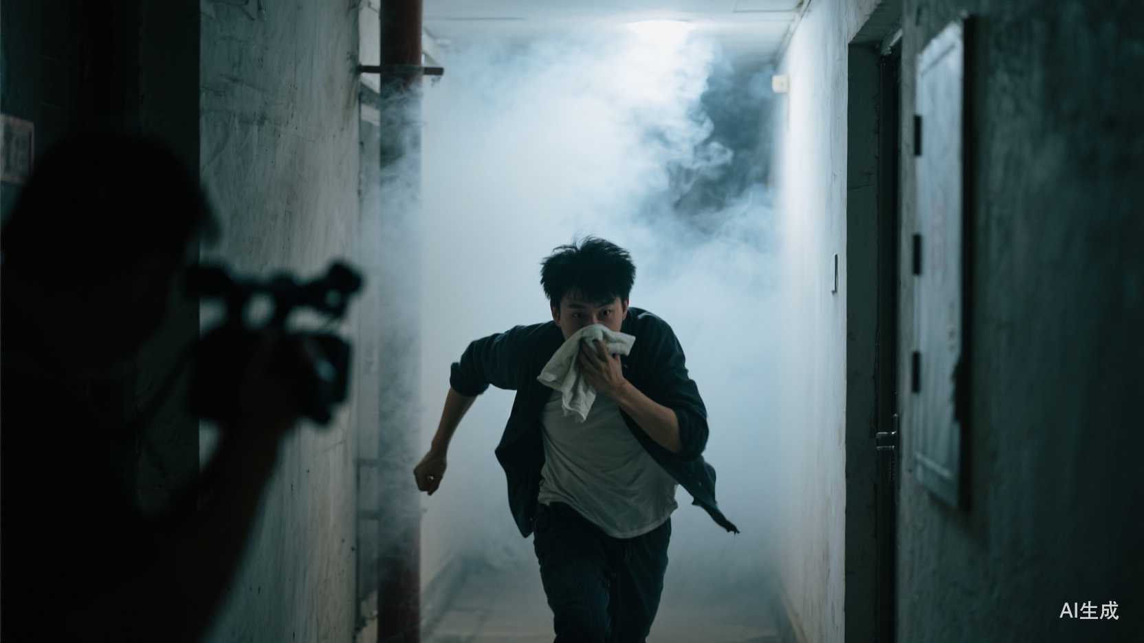 (第一视角感受穿越浓烟。注意:真实火灾中,类似情况下严禁盲目逃生)