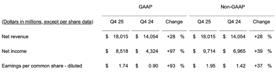 净利润85.18亿美元,同比上涨97%; 每股摊薄收益为1.74美元,同比增长93%。 按照美国通用会计准则,博通第四财季净利润为97.14亿美元 ,合每股收益1.95美元,超出华尔街分析师平均预计的1.86美元。