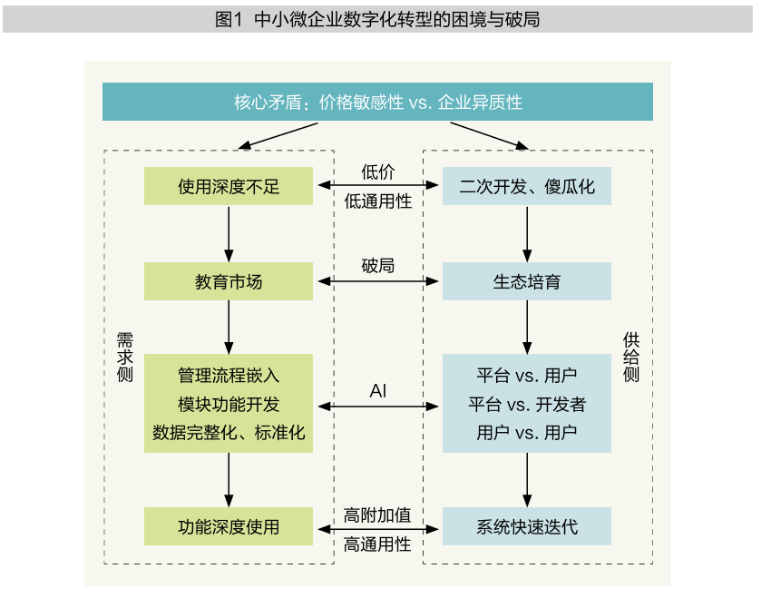 在基础数据录入和功能模块使用上,中小微批发零售企业集中于销售环节,其他环节的数据积累和功能使用较少,且用户间存在较大差异。管理数字化软件使用深度上的不足反映了中小微企业数字化转型的关键矛盾,即中小微企业价格敏感性高、异质性大,而低成本的通用性软件难以满足异质性的数字化需求。这是大量商业和工业软件企业在服务我国市场,尤其是中小微企业市场时所面临的共性问题。突破这一困局的思路,需要同时从供给侧和需求侧入手(见图1)。