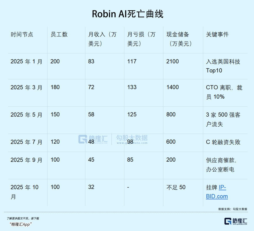 到9月,Robin AI的月度收入从峰值83万美元跌到45万美元,已经到连房租和薪水都付不起的地步……