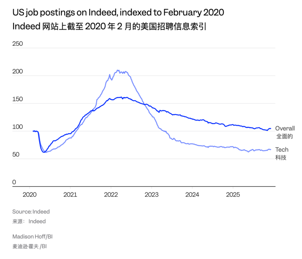 整体劳动力市场虽然招聘放缓,但解雇率仍然偏低,起到了一定缓冲作用——科技行业却不在此列。对科技从业者而言,就业形势尤为严峻。他们不仅要与不断增加的被裁员工竞争,还要面对应届毕业生,以及在职但想跳槽的技术人员。