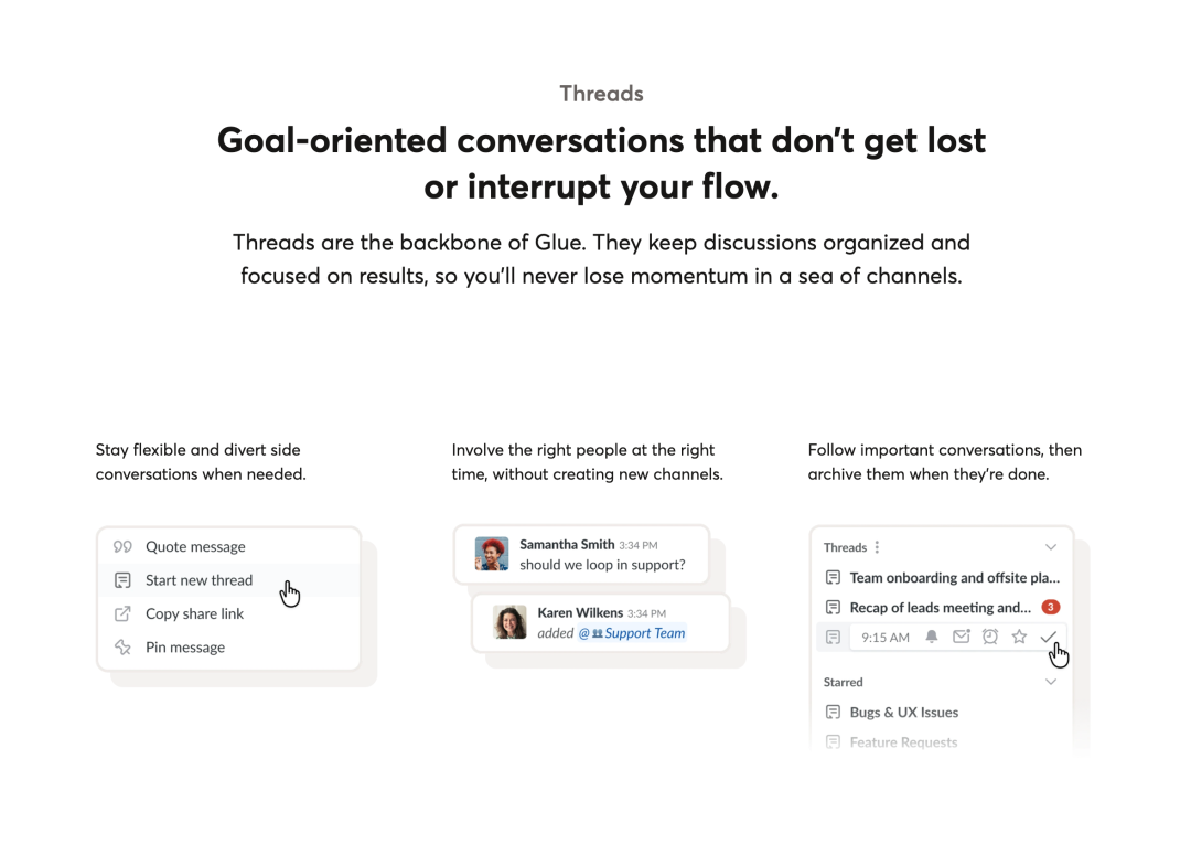 Glue的核心创新在于把"线程"而不是"频道"作为协作的基本单位。这听起来是个小改动,但实际上改变了一切。在Slack中,如果你要讨论一个具体的工作项目,比如开发一个邀请链接功能,你可能会在产品频道里开一个讨论串。但如果设计师也需要参与这个讨论,你就得把所有设计师都加入产品频道,这样他们才能看到这个讨论串。问题是,从此以后,这些设计师就会看到产品频道里所有的讨论,即使其中90%与他们无关。