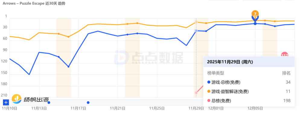 近期,我们在榜单上注意到一款“极简”风格的作品——《Arrows–Puzzle Escape》,是德国厂商Lessmore UG旗下的休闲解谜游戏。游戏于2025年08月09日上线,一个月后就冲上了美国的谷歌免费榜,截至12月4日,已经蝉联了两周的免费游戏榜TOP10。