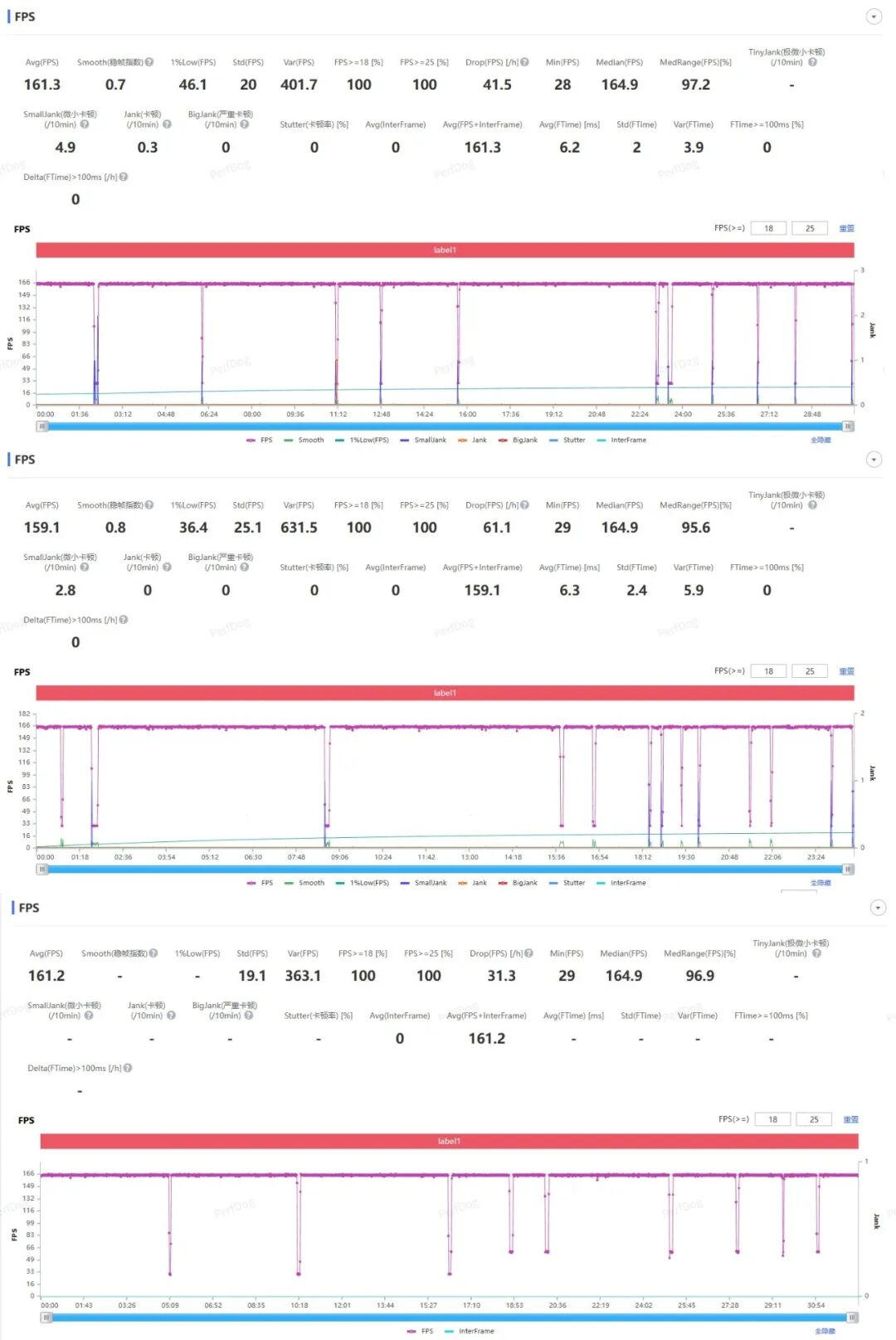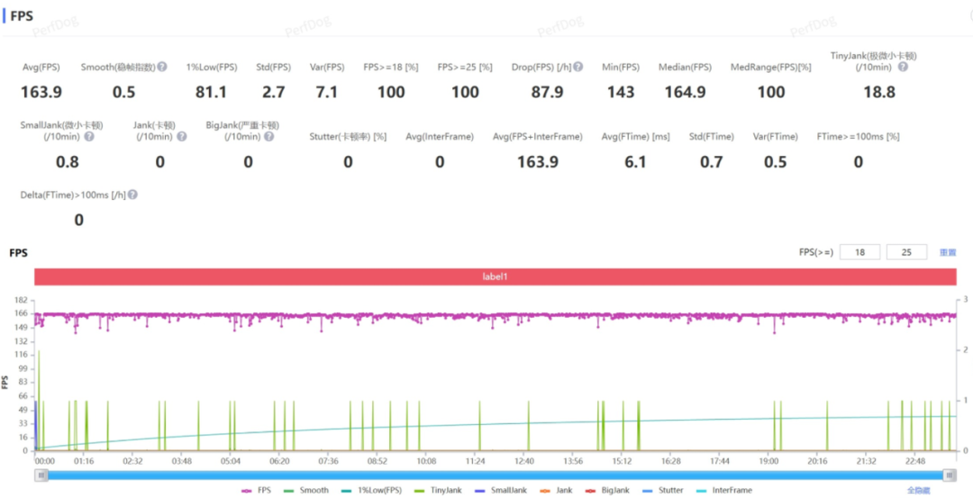 根据Perfdog监测到的数据来看,经过30分钟测试,一加Ace 6T平均帧161帧,在死亡时会有掉帧,其余时候基本稳在165帧,这一点从中位数164.9帧就能看出来。