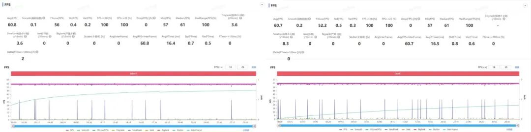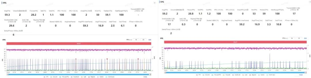 根据Perfdog监测到的数据来看,这俩芯片的平均帧率和1%Low帧都差不多,并没有参数上的差距那么大。