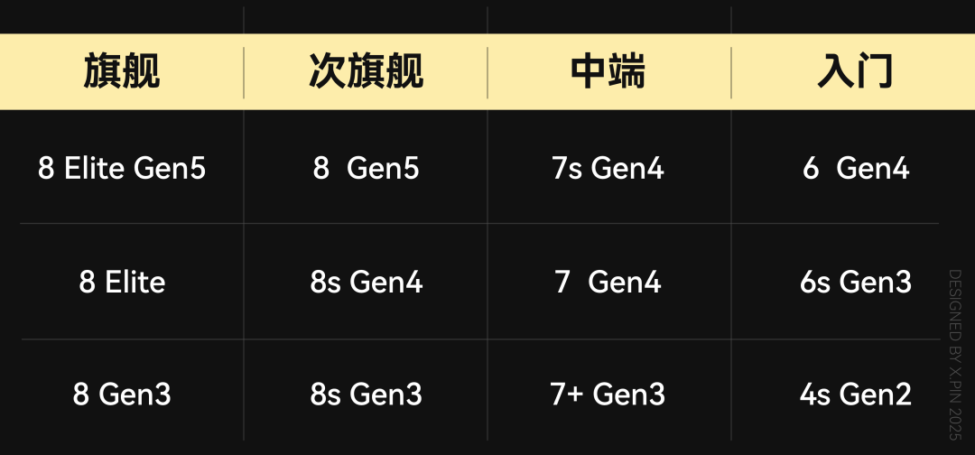 所以从定位上来说,这芯片跟骁龙8 Elite Gen5这种旗舰芯片还是有点差距的,至于其他高通芯片的定位,大家可以参考下面的表格。