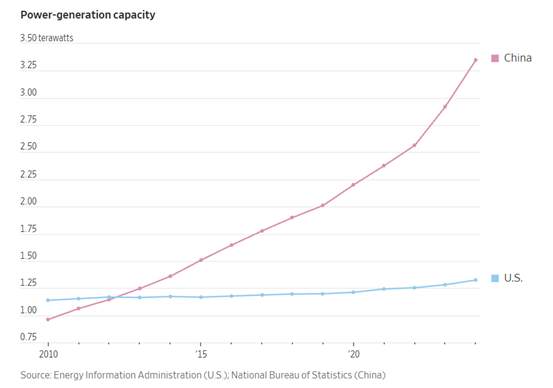 中国电力装机容量达到3.75太瓦,是美国的2倍多。2010到2024年,中国新增的发电能力,超过了世界其他国家的总和。2024年,中国的发电量是美国的2倍。而在电价上,一些中国数据中心支付的电费,不到美国数据中心的一半。