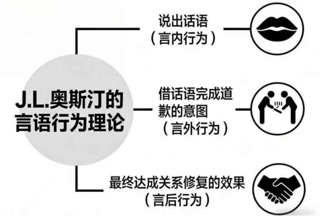 他认为,说话本质是“做事”。一次完整的道歉应包含三重行为:说出话语(言内行为)、借话语完成道歉的意图(言外行为)、最终达成关系修复的效果(言后行为)。