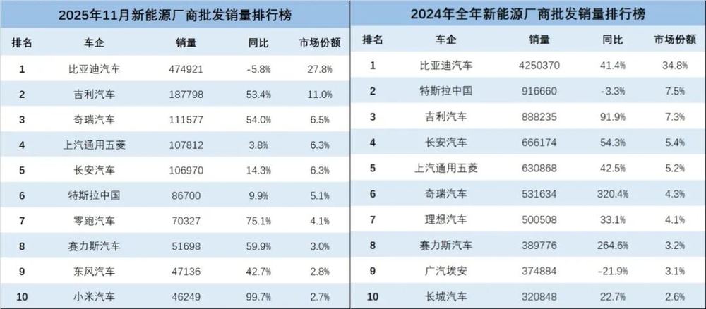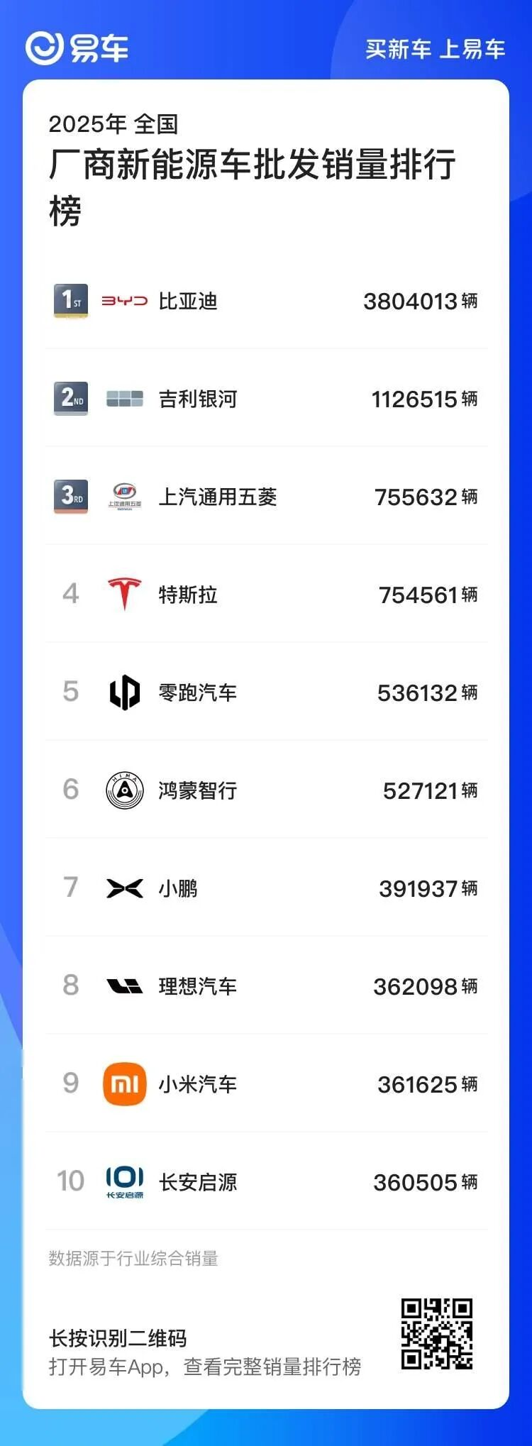 本文来自微信公众号: AutoReport 汽车产经 ,编辑:甘猛,作者:吴雪,原文标题:《奇瑞逆袭,理想跌出前十 2025新能源格局巨变》