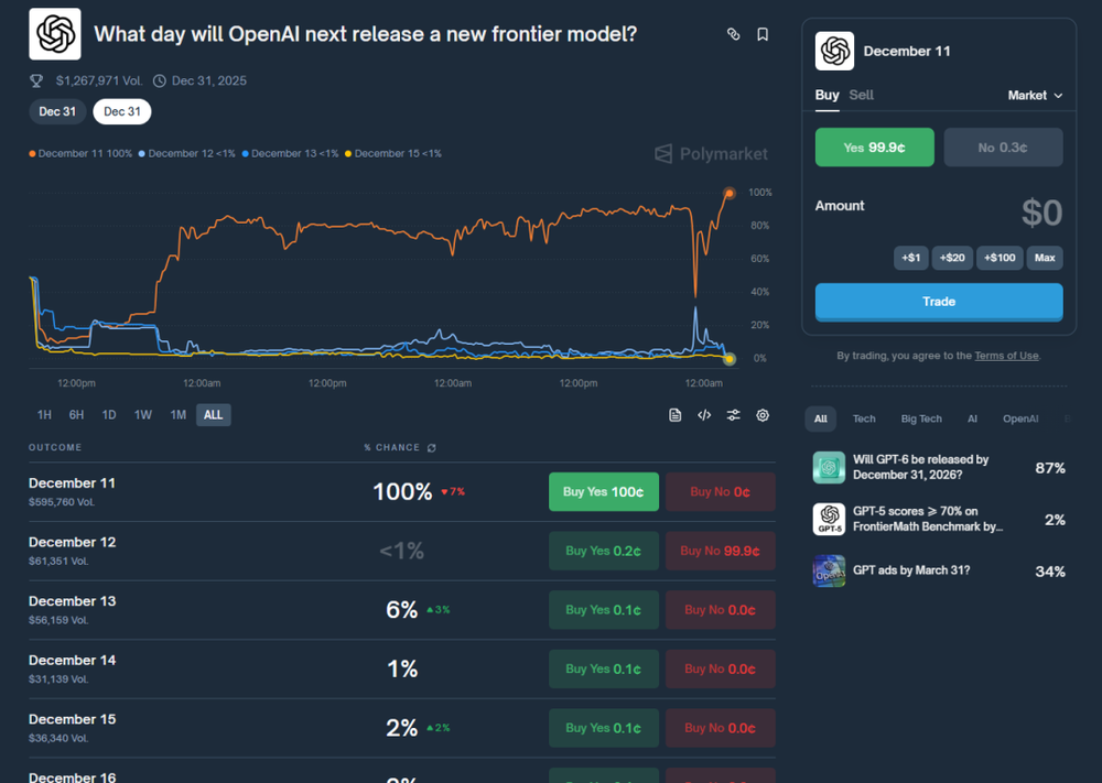 可以看到,在11号前几天,预测GPT-5.2会在11号(美国时间)发布的概率就居高不下,一直维持在80%以上,除了当天凌晨11点到12点的区间中,有一波巨大的震幅,发布的概率一下子变低了,其他时间的概率一直都维持在非常高的位置,1点的时候,几乎就是100%发了。