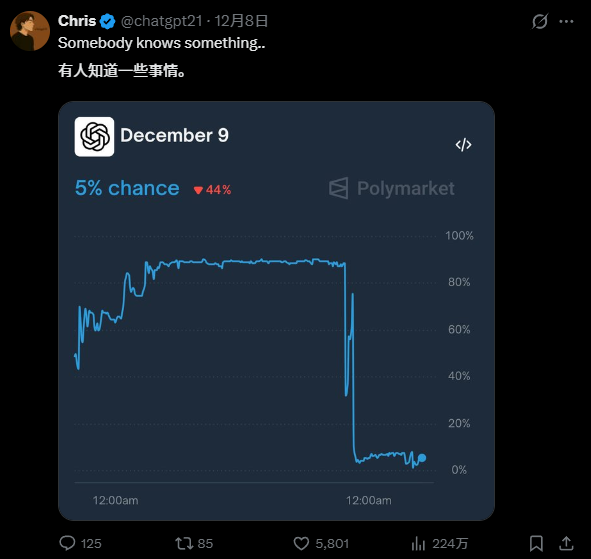 而且不止是11号,早在12月8号,大家都觉得9号会发新模型的时候,这个平台,就一波直线跳水预测,说,明天OpenAI发东西的概率只有百分之五,几乎不可能,大家别等了,洗洗睡吧。