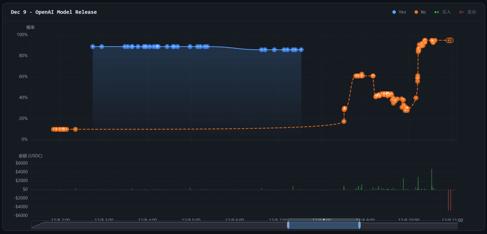 比如有一个哥们叫pony-pony,这个人在12月9号OpenAI会发新模型这个盘上,先是用几乎一整晚上,在90%的价格重仓买Yes,相信12月9号一定会发新模型。