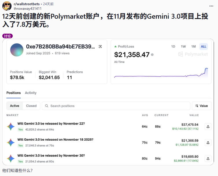 还有一个月前,Gemini 3发布那次,一个刚注册没多久的新账号,一口气掏出了七万八美元砸在yes里,就赌Gemini 3会在11月发布。