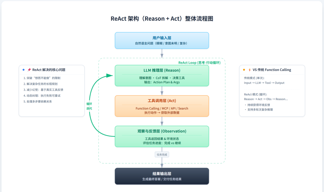 相信从这里大家也看出来Agent的核心价值了: 他会大大增加我Workflow的泛化能力!模型用ReAct式的思考-行动-观察循环,来决定怎么排列组合这些Tools: