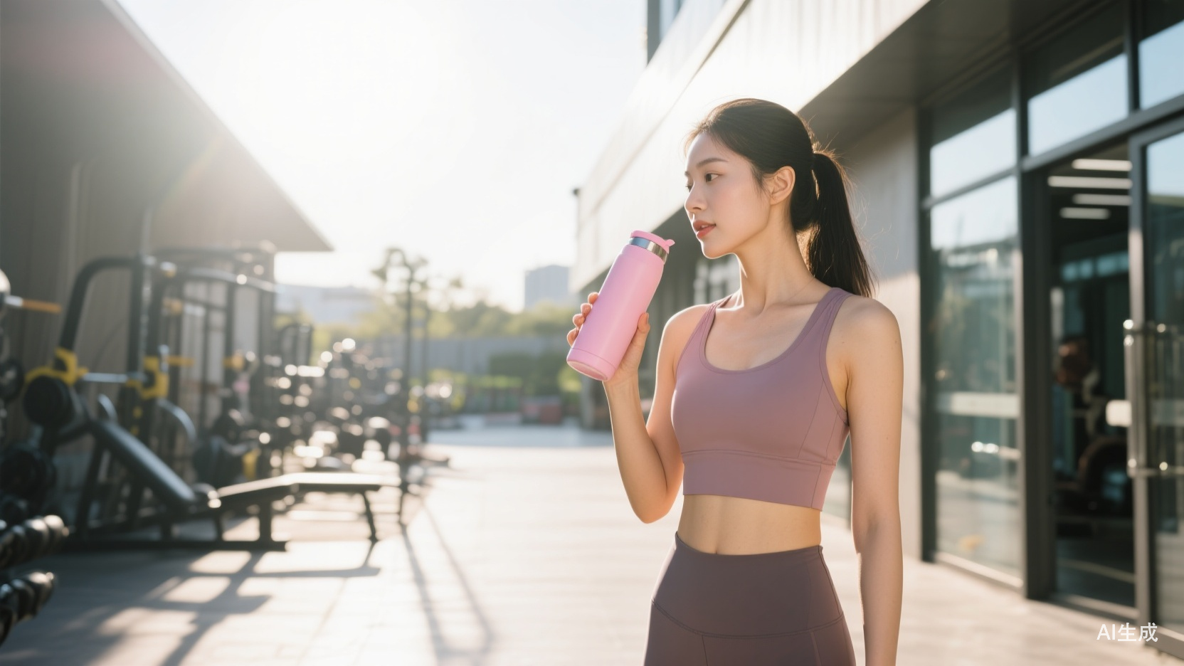 一辆保时捷Cayenne缓缓驶来、停在健身房旁,车门打开,一位女性身穿lululemon Align,手里拿的是她最心仪的、粉色款的Stanley Quencher保温杯。