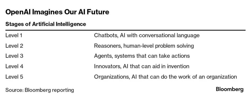 (注:L1:对话AI/聊天机器人;L2:推理者;L3:Agent/代理;L4:创新者/人类知识扩展者;L5:组织者)