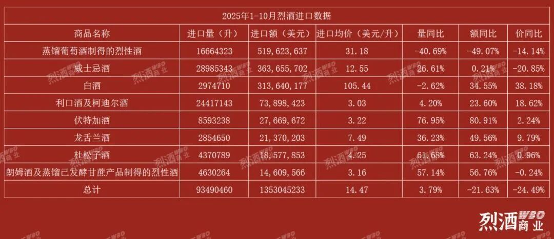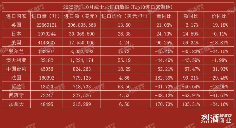 根据海关总署公布的进口数据,今年1-10月,威士忌的进口量为2898万升,同比增长26.61%,进口额为3.63亿美元,同比增长0.21%,进口均价为12.55美元/升,同比下降20.85%。其中,来自英国、日本、美国的威士忌的均价分别为13.6美元/升、28.38美元/升、4.24美元/升,同比下降19.18%、0.11%、18.81%。
