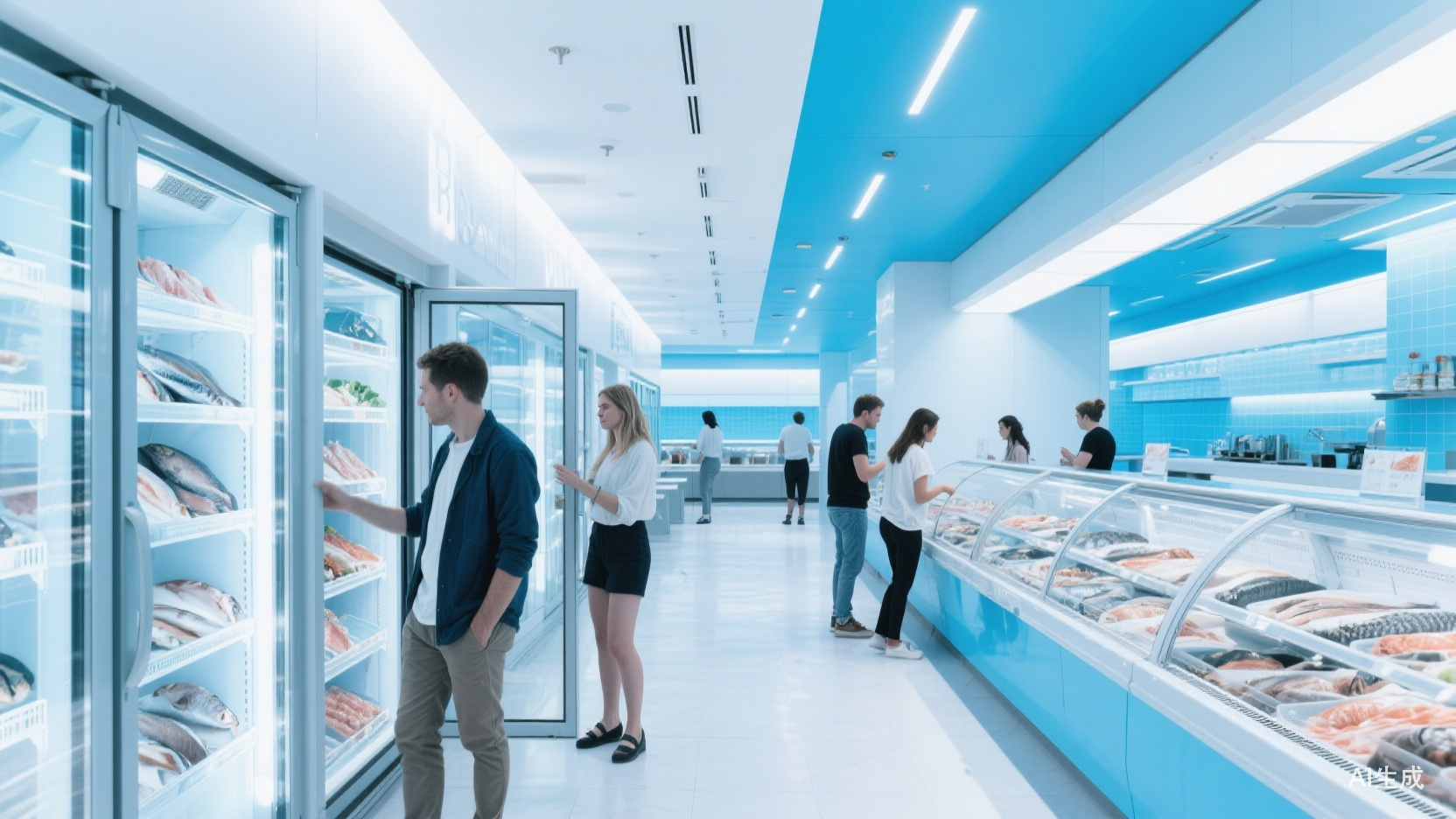 店内以蓝色墙面为背景,围绕大型冷藏柜与明档展开布局,员工身着纯白工装、佩戴口罩,强化现制现做的专业感,整体以冷色调和通透设计传递洁净、鲜活的视觉印象。