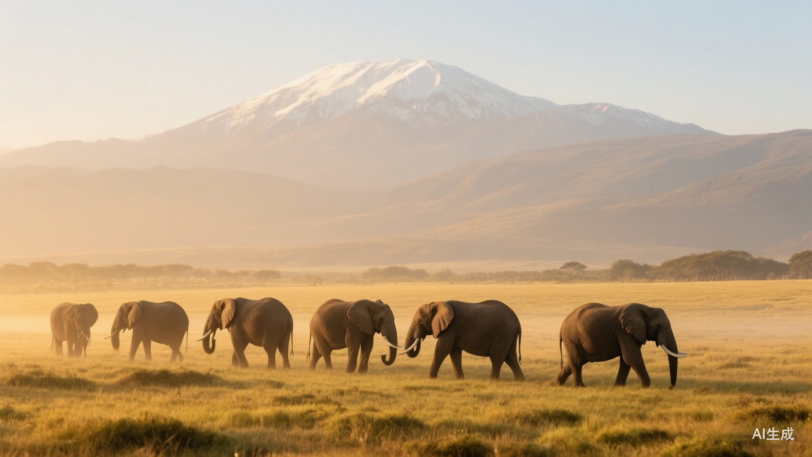安博塞利是她的最爱,雪山在远处,大象在脚下,安博塞利是那种,会让你对“比例”产生错觉的地方。清晨,乞力马扎罗雪峰悬在天际,白得干净,白得不真实,像一块被时间遗忘的背景布。而雪山之下,是成群结队的大象。它们走得很慢,脚步沉稳,扬起浅浅的尘土。巨大的身躯在晨光里移动,却没有一点侵略感。雪山不动,大象在走,天地之间仿佛只有这一件事在发生。那一刻你会明白——肯尼亚的美,是把世界最不相干的元素,放在同一幅画里。