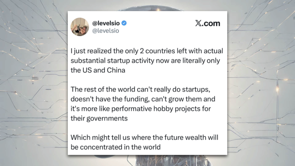 “我才意识到,现在只剩下两个国家拥有‘实质性’的创业活动:美国和中国。世界其他地方基本上做不了初创企业,没有资金,无法增长。它们更像是为了取悦政府而进行的‘表演性’业余项目(Performative hobby projects)。这张图或许告诉了我们,未来的世界财富将集中在哪里。”