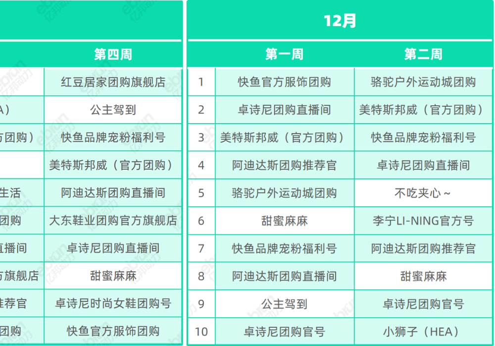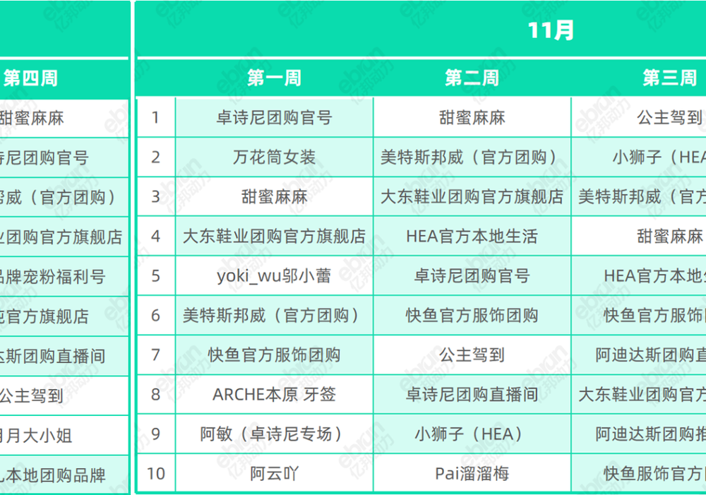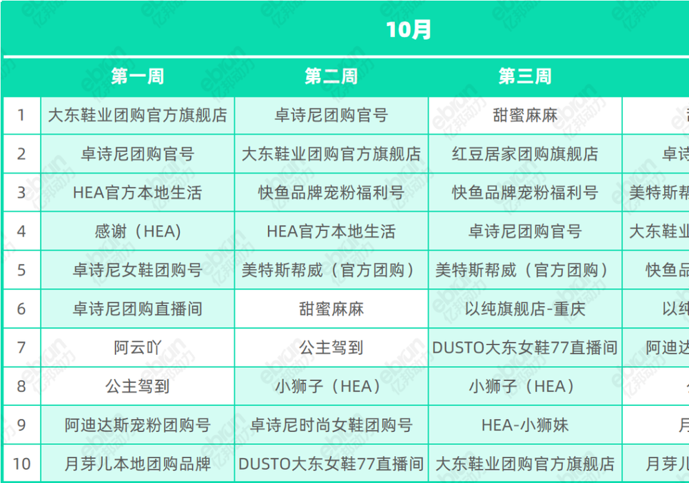 2025年第四季度,大东鞋业、卓诗尼、快鱼、HEA、阿迪达斯、美特斯邦威、以纯、红豆......都通过这样的方式,闯进抖音生活服务全国潮流服饰榜。以下为榜单具体排名,其中标绿账号为品牌商家账号,其余为达人账号。供大家参考: