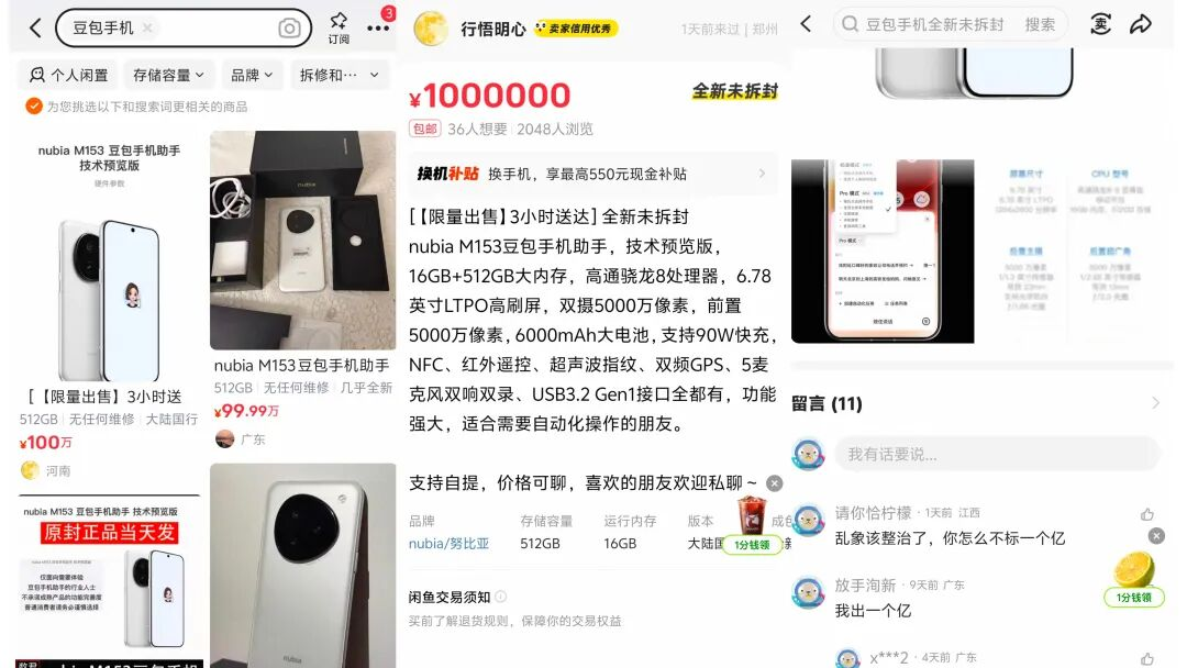 与此同时,时代周报记者注意到,在二手交易平台闲鱼上,豆包AI手机的最高标价已达到“100万元/台”的惊人天价。