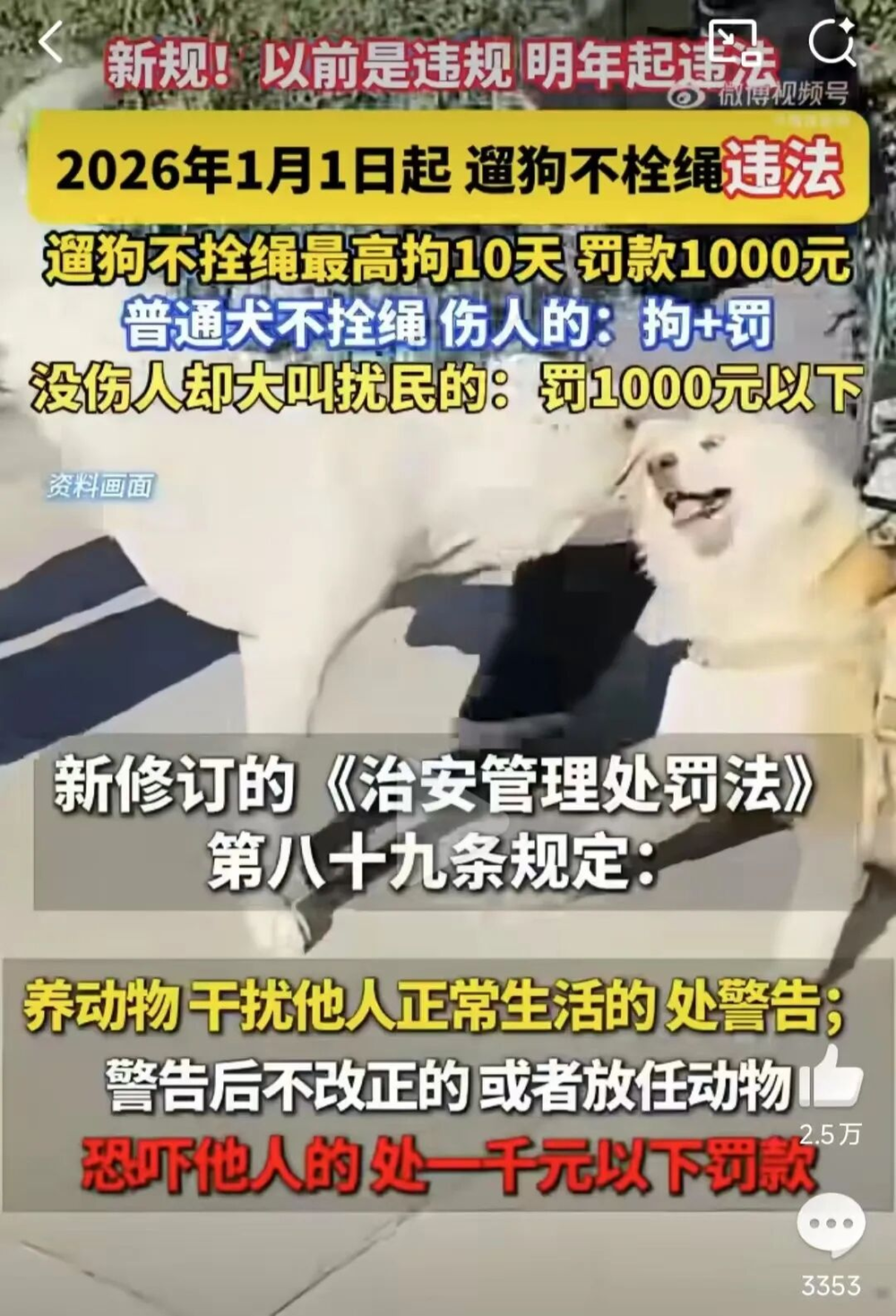 顺便提醒一句,从明年1月1日开始,遛狗不牵绳可能涉嫌违法,最高可拘10天,罚款1000元。