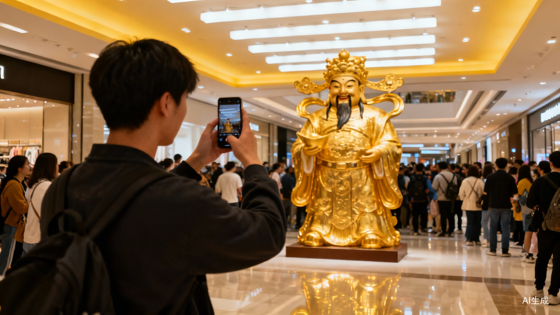 他从王府井站E1口出了地铁,随即推门进入王府井喜悦。原本上楼找餐厅的他,却被三楼一片金光截胡——里面的财神像正笑着冲他招手。