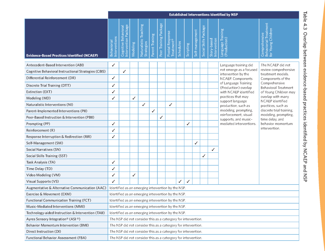 过去10余年,围绕综合干预模式,已经诞生了多个相关的自闭症循证干预方法(Evidence-based Practices,EBPs)的分类体系,总体上,都在这个评价方法框架以内。