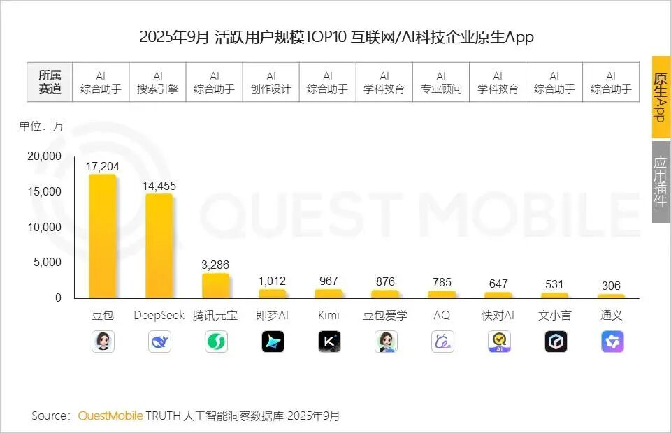 根据QuestMobile 2025年第三季度报告,豆包、千问相关应用分别位列AI应用月活前列,而a16z全球消费级Gen AI榜单中,阿里系与字节系产品共同占据五席中的三席,“南北双雄”的行业格局已然成型。