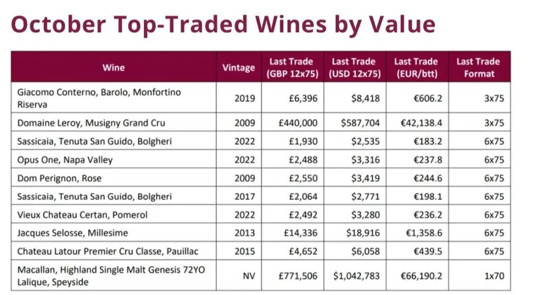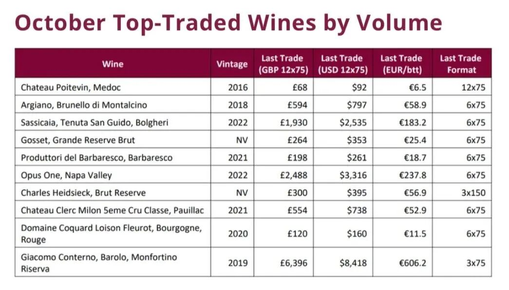 按交易价值计算,贾科莫·孔特诺酒庄、拉图酒庄一级庄以及作品一号等均在当月热门葡萄酒交易榜中。