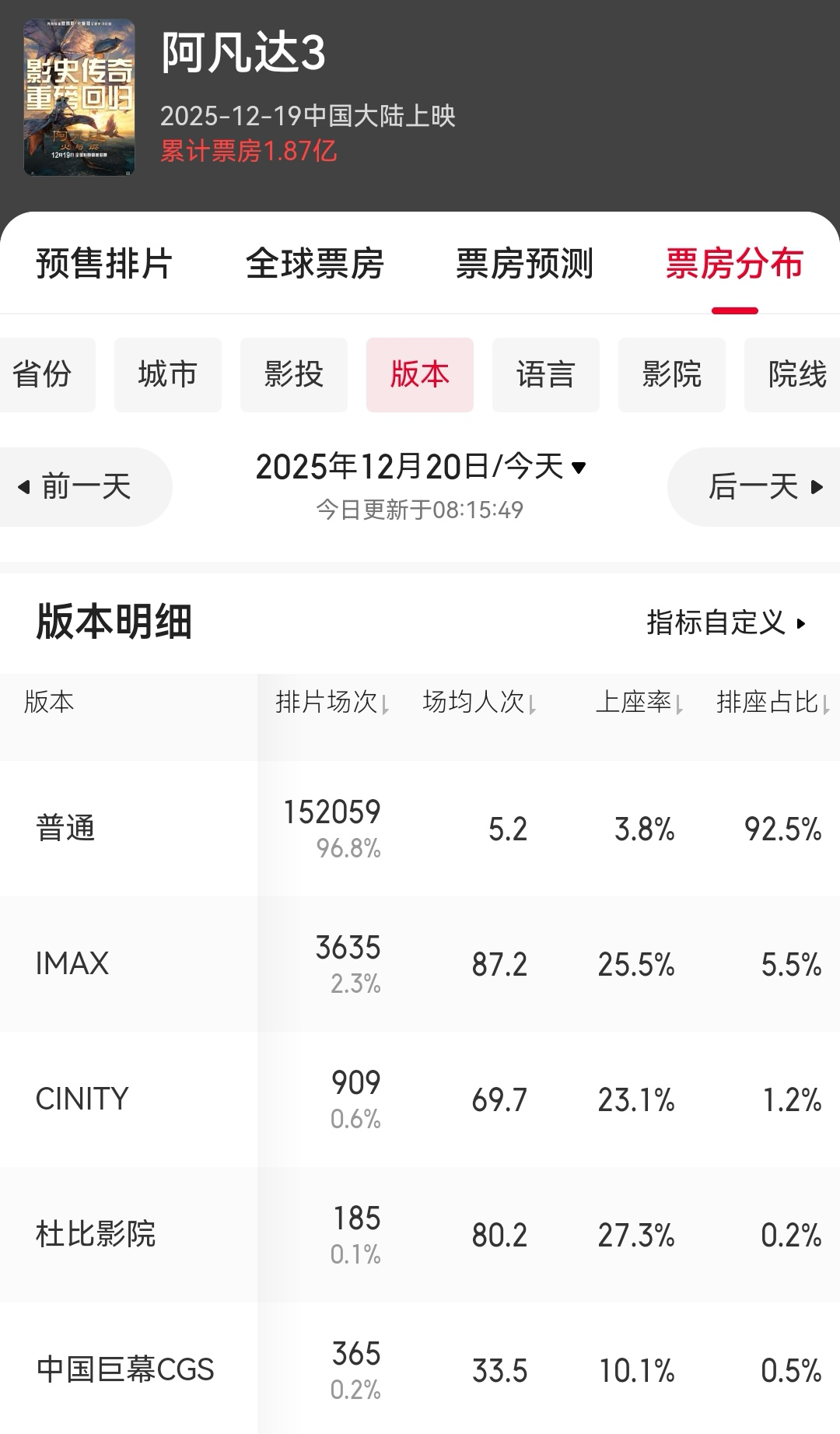 这就让我们可以预见到一件事:再过十天的跨年档,普通厅会被分流给一众国产新片,而高端厅很可能仍被《阿凡达3》所占据。