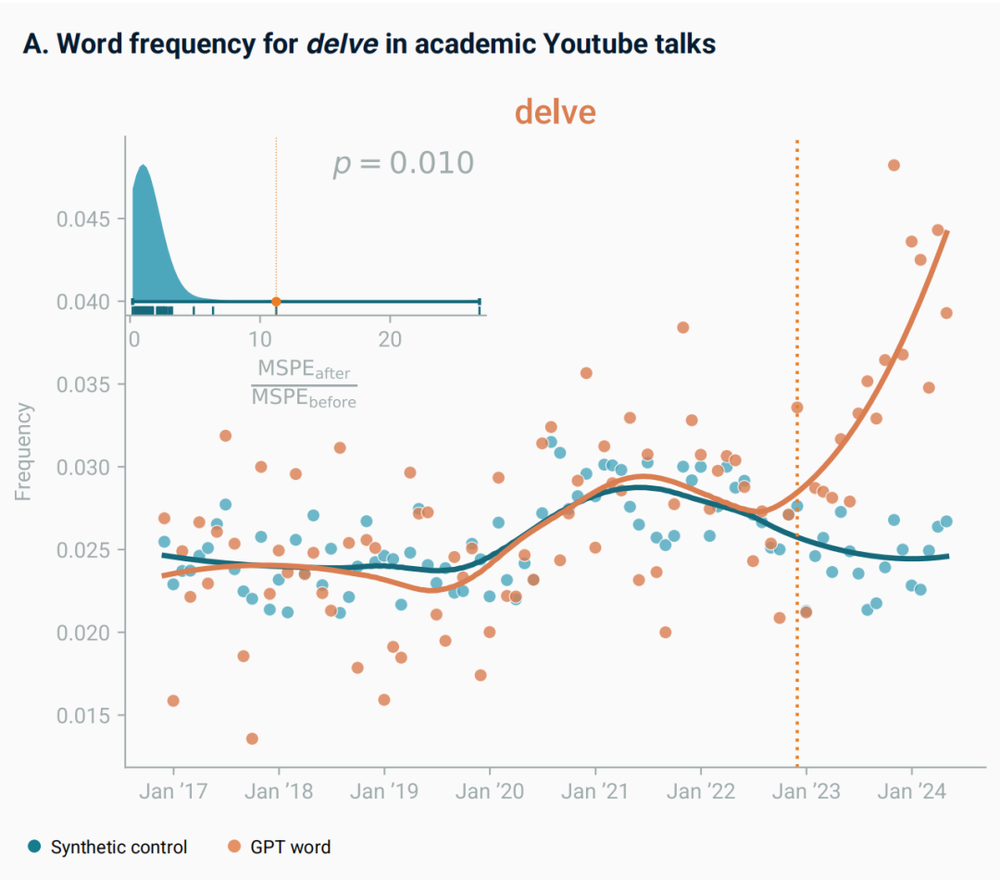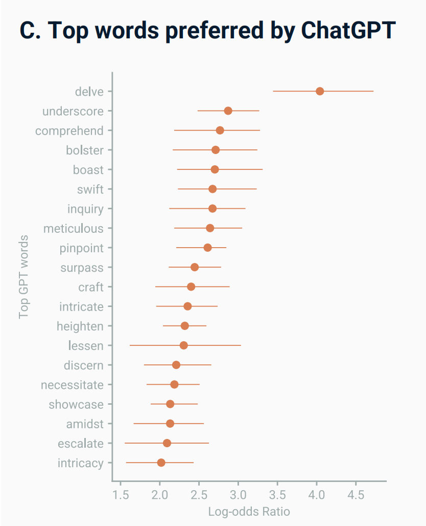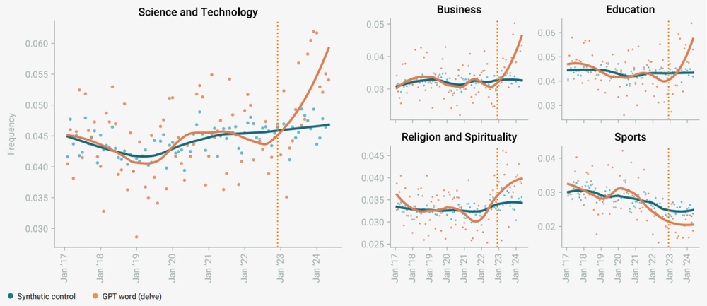 而在现实宇宙中,这些词的暴涨与技术发布的时间点完美契合,这就让AI作为语言习惯改变的主要因素,显得更有说服力了。