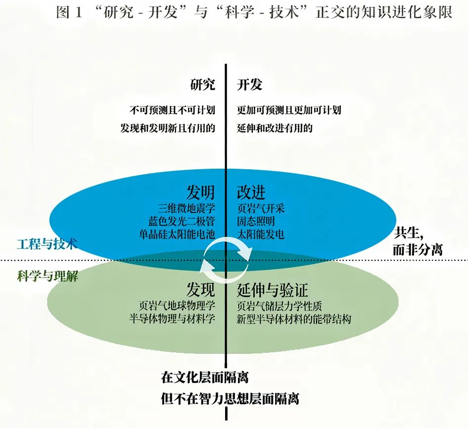 “先立后破”的方法论决定了,有效抑制学界的“独立王国”和“自我服务”倾向,也是强化“企业科技创新主体地位”的重要内容。当领导人都感慨基础研究“两头在外”时,我们就要反思:“把论文写在祖国大地上”的政治导向因何遭遇“落地难”?首先是对纯基础研究的追捧与迷信,包括“无用之用”“科学无国界”等陈词滥调。我们需要对基础研究祛魅。图1的知识分类代表了某种尝试。它跳出传统三分法下“科学研究”与“技术开发”对立的限定,从“发明—发现循环”的视角出发,建立“科学-技术”与“研究-开发”的正交分类,从而以研究型和开发型科学之分,为期刊和人才评价的“代表作评价制度”提供了参考。另一重要原因是技术官僚的行为惯性。大批高等教育管理者过于强调当前政策转向的延续性、增量性和业务性,低估其颠覆性、范式性和政治性成分。结果是在人才评价中,西方学术搬运工式的研究,仍然能通过“人海战术”碾压解释中国现象、响应中国需求的研究;但代价是整个科研群体的内卷、依附性与过劳死。此时,“不换思想就换人”的决断,或是走出当前困境的必要条件。