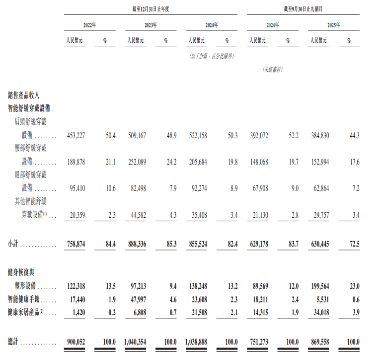 根据公司最新招股书,虽然2025年前九个月公司总营收增长16.22%至8.78亿元,但作为公司基石的核心品类——“智能舒缓穿戴设备”收入仅为6.3亿元,同比微增0.2%,增长几乎停滞。