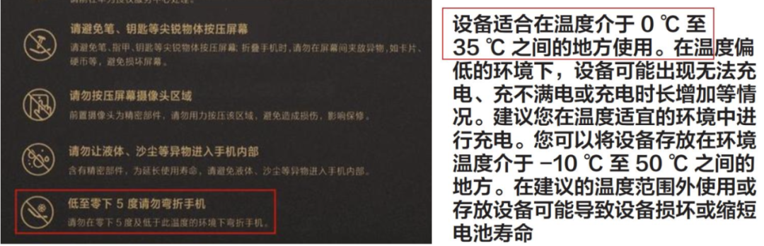 说明书和宣传之间的差异,可能是考虑到了整机各个部件,也可能是厂家的稳妥之举:理论上是没问题,但不建议你冒险,更不建议你经常在低温下折叠。毕竟温度越低,折坏屏幕概率越大。