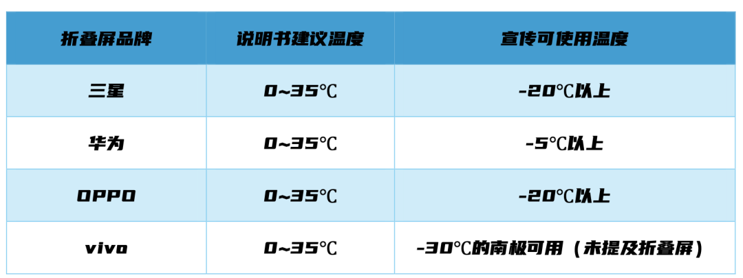 目前主流折叠屏手机,说明书上标明的适宜工作温度都是0-35℃