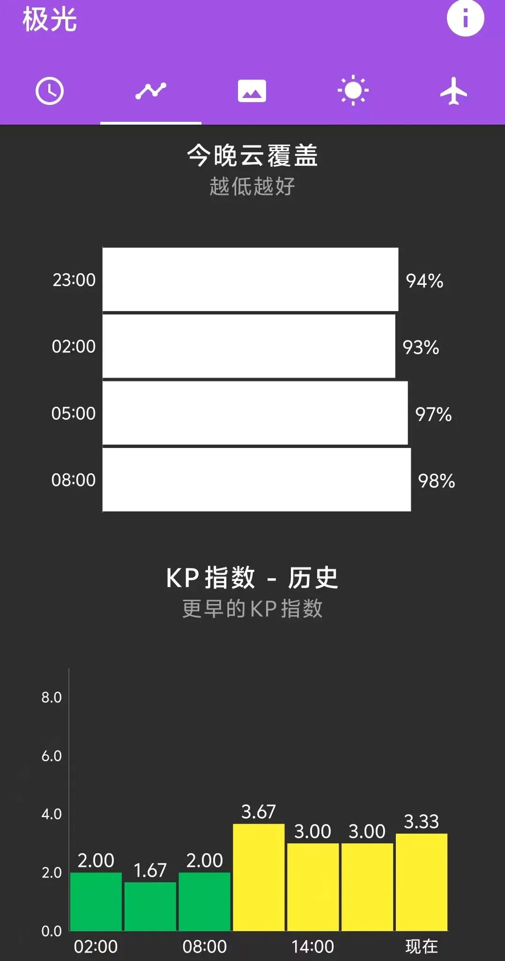 这次我们一共追光3次,三晚的KP指数都低于3(地磁活动指标,范围1-9,数值越高表示地磁活动越强,极光概率更大效果更强);天气情况第一晚少云、第二晚大雪、第三晚多云;综合看,在摩尔曼斯克待的5天4晚竟没有一天极光概率(预报)高于30%。