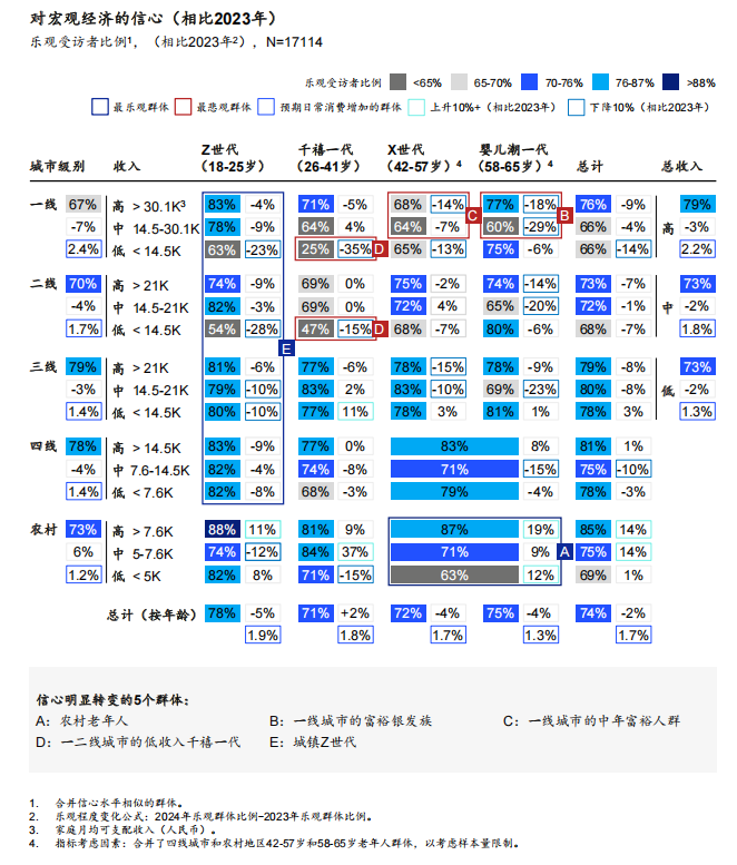 特别是一些曾经非常乐观的群体。比如,一线城市的高收入X世代(42-57岁),乐观比例从去年的82%降到了68%,下降了14个百分点。一线城市的富裕银发族(婴儿潮一代,58-65岁),乐观比例也从95%降到了77%,下降了18个百分点。