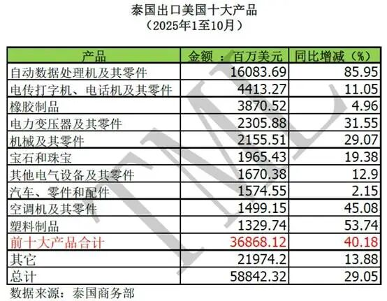 今年1至10月,泰国对美国出口同比增长29%,其中前十大产品增长超过40%: