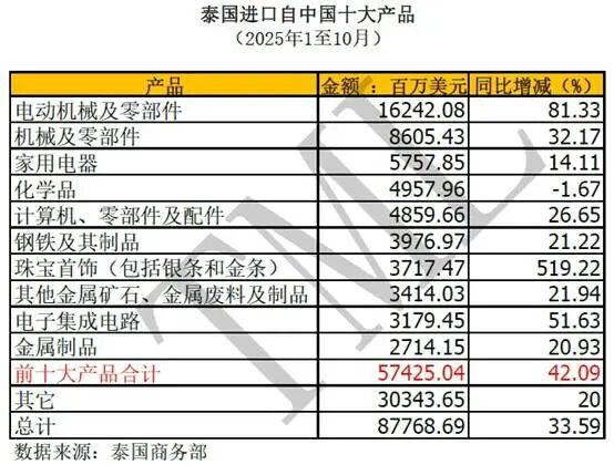 同期,泰国从中国的进口增长33.59%,前十大产品增长超过42%: