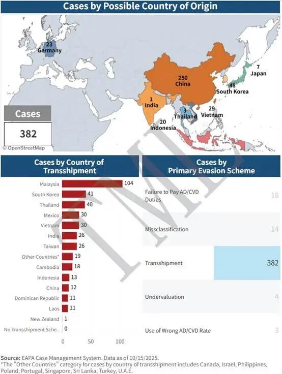 自2016年以来,美国海关和边境保护局(CBP)依据《执行与保护法》(EAPA)展开积极的关税反规避调查,截至2025年10月15日,反转运案件数已达到382件,主要涉及中国、韩国、马来西亚、越南、泰国、印度尼西亚、柬埔寨、老挝、印度等主要出口国,涵盖纸张、金属制品、木制家具等产品。