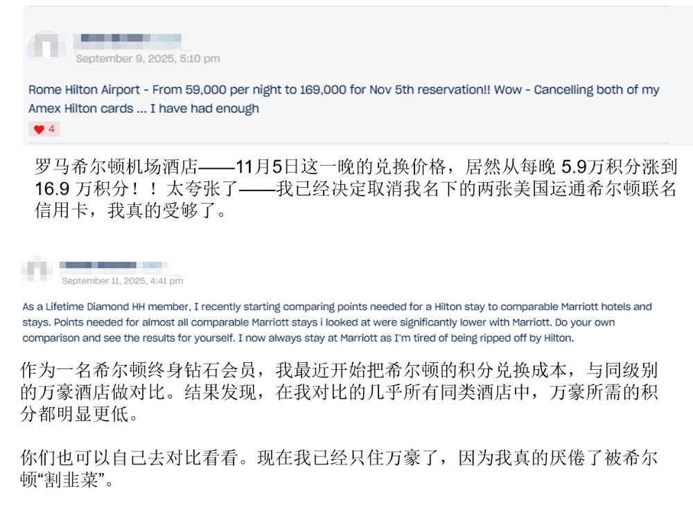 还有跟A君一样的希尔顿终身钻石会员,拿希尔顿的积分兑换成本,跟万豪做了对比,结果发现万豪性价比更高,他在帖子里是这样写的:“现在我已经只住万豪了,我真的厌倦了被希尔顿‘割韭菜’。”