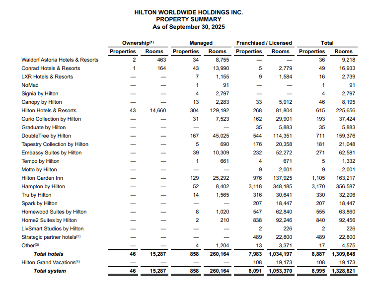 按照2025年Q3财报,希尔顿全球共有8,995家酒店,1,328,821间客房,奢华酒店的占比只有1.17%,房间数占比也仅2.38%。