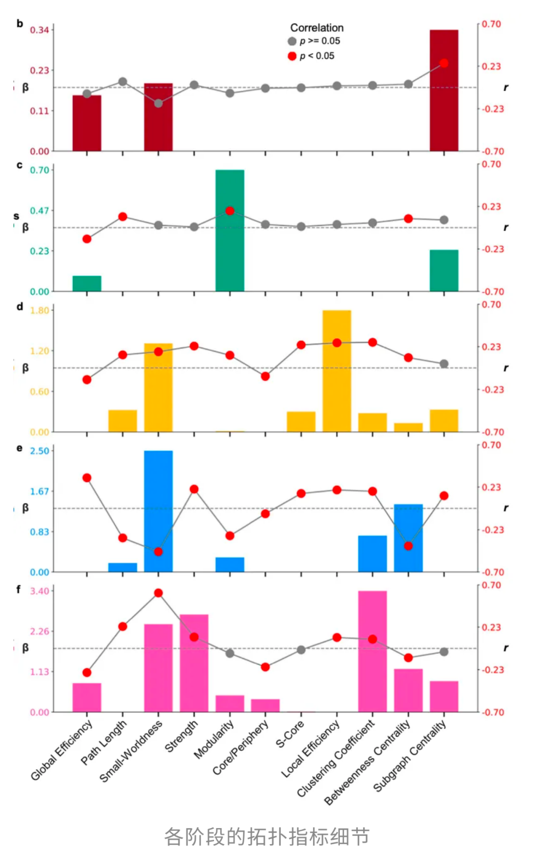 这些指标听着很抽象,实则不然。我们不妨把大脑理解为一个大型社交网络,里面有不同的「朋友圈子」(比如运动控制圈子、语言处理圈子、视觉圈子)。模块化高,意味着各个「朋友圈」内部来往频繁,但不同圈子之间交流不多。整合度反映信息传递是否高效,路径越短、越直接,整合度就越高。中心性代表网络中的「交通枢纽」,一旦这些关键节点受损,整个系统都会受到牵连。