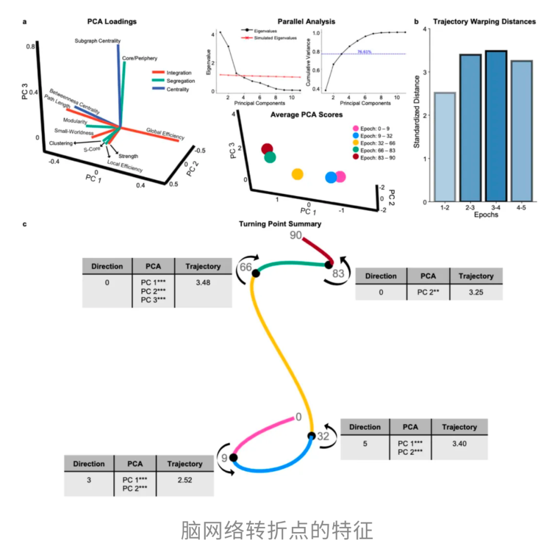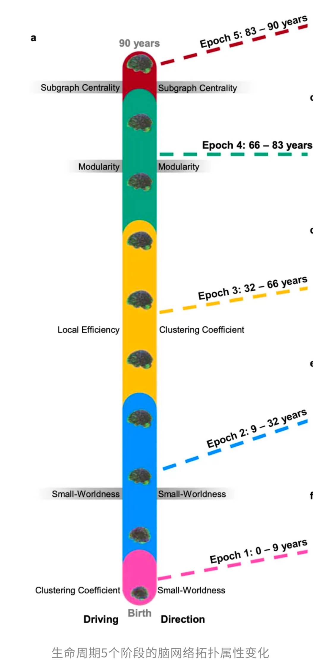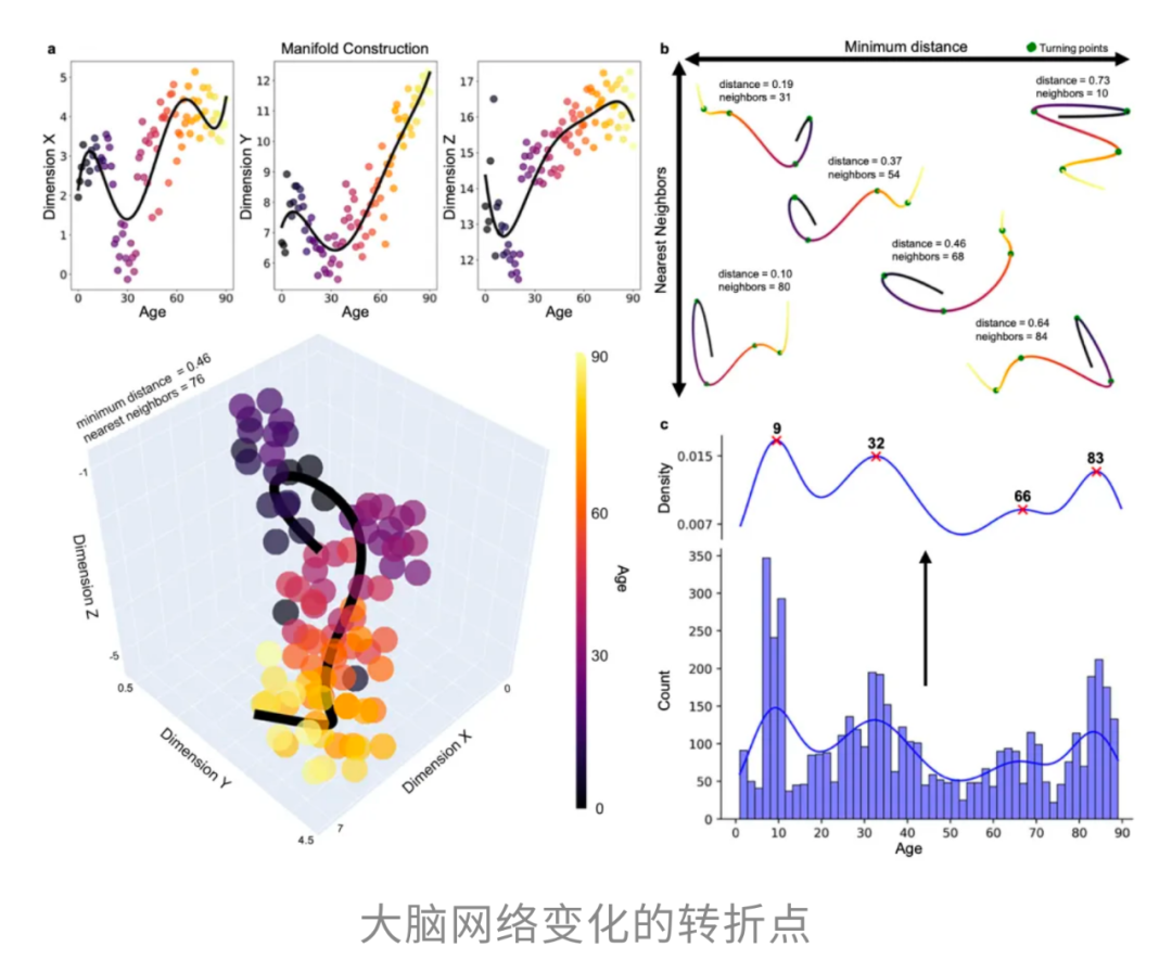 研究者通过分析这条轨迹的弯曲方向,精准锁定了4个转折点,据此把人生划分为5个阶段。其中,32岁被证实是大脑网络整体性能达到峰值的阶段。
