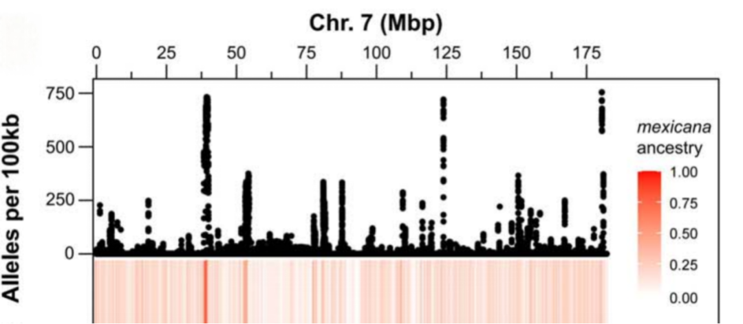 现代玉米中超过80%品系在7号染色体上都存在来自墨西哥玉米的等位基因,而且分布特征呈现显著差异,绝大多数渗入的单倍型规模较小——约10千碱基对,这表明其起源年代较为久远。图源:引自文献[1]