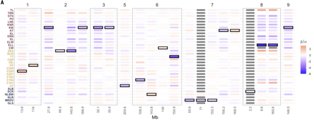 除了适应性性状,墨西哥大刍草的基因还显著提升了玉米的产量和品质。通过全基因组关联分析(GWAS),研究人员在玉米基因组中鉴定出25个与农艺性状相关的关键位点,其中包括控制穗行数、籽粒大小、含油量和抗病性的基因。例如,墨西哥大刍草的基因贡献了近25%的穗行数遗传变异,让玉米的穗行数从原始的2行增加到现代的8-16行。在抗病性方面,这些基因更是解释了高达50%的遗传变异,帮助玉米抵御多种真菌和细菌病害。