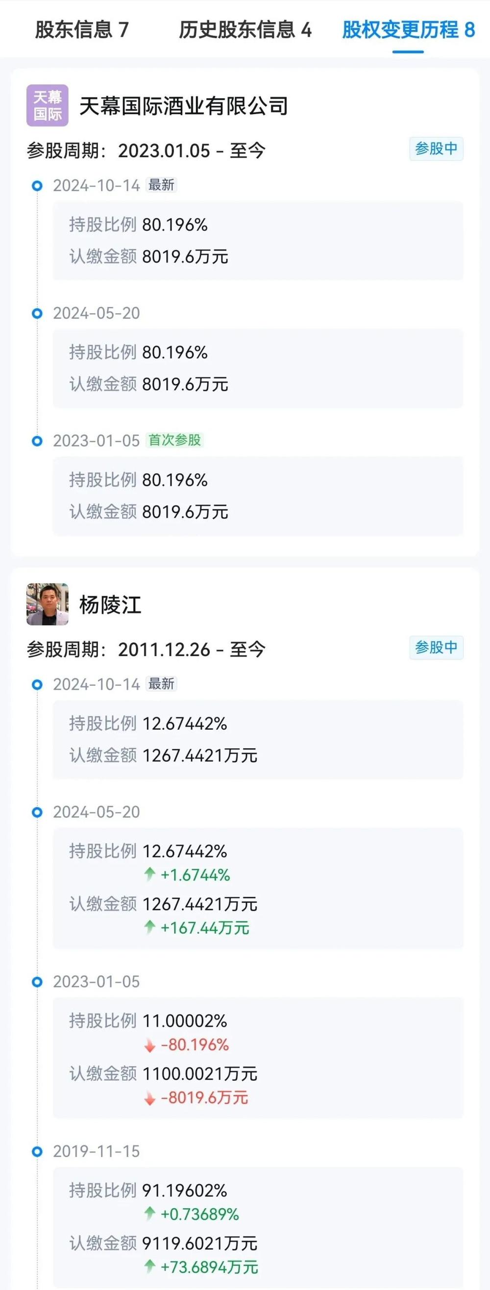 每经记者注意到,2023年至今,壹玖壹玖集团有限公司的股权曾发生工商变更。天眼查显示,2023年1月,杨陵江的持股比例,由约91.2%降至约11%,新增天幕国际酒业公司为控股股东,持股80.196%,成为第一大股东。