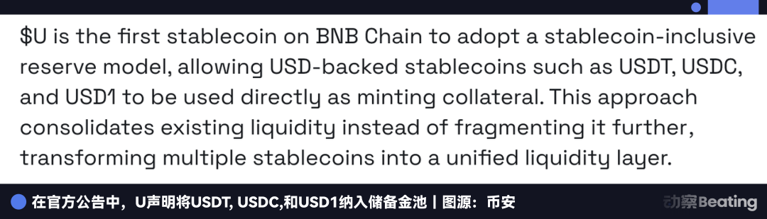 U的设计逻辑与前两者截然不同:它不直接与USDT,USDC或USD1竞争,而是将它们都纳入自己的储备金池。某种意义上,U是「稳定币的稳定币」,或者说「稳定币ETF」。